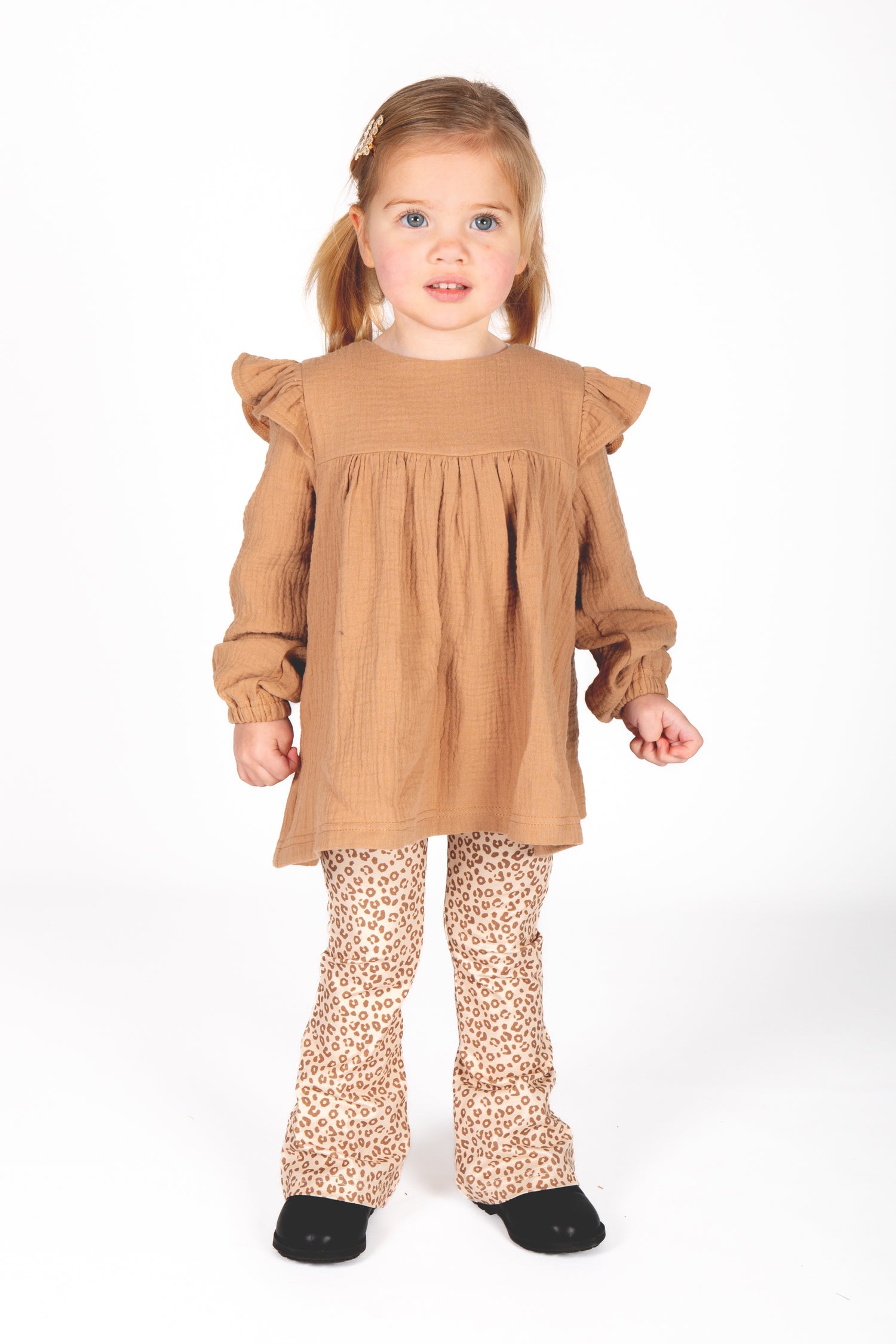 Super gave flared legging met een leuke panterprint. De print bestaat uit bruine pantervlekjes in een warme bruine cacao kleur. Deze flared legging wordt met zorg handgemaakt in ons eigen atelier en is verkrijgbaar in de maten 74 t/m 134. De zachte, rekbare stof biedt ultiem comfort en beweeglijkheid, terwijl de wijde pijpen een speelse en stijlvolle look creëren.