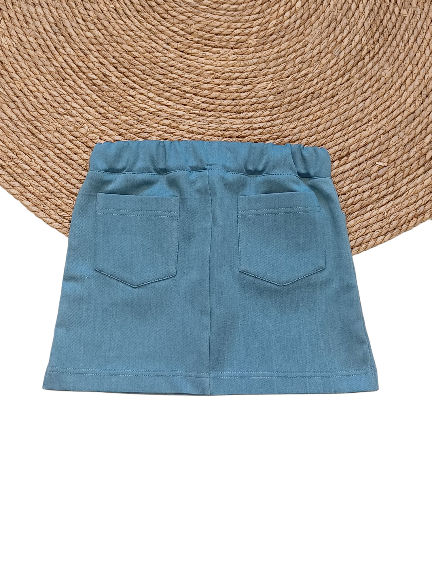 De gulp en knoopsluiting geven het rokje een trendy, eigentijdse look, terwijl de elastische tailleband zorgt voor een fijne pasvorm die nergens knelt. De steekzakken vooraan zijn ideaal voor kleine schatten, en de sierzakjes op de achterkant maken de outfit helemaal af.